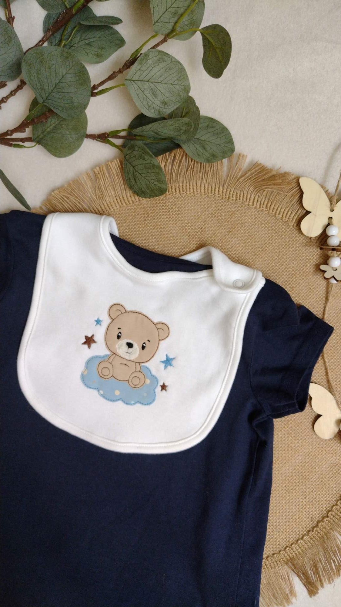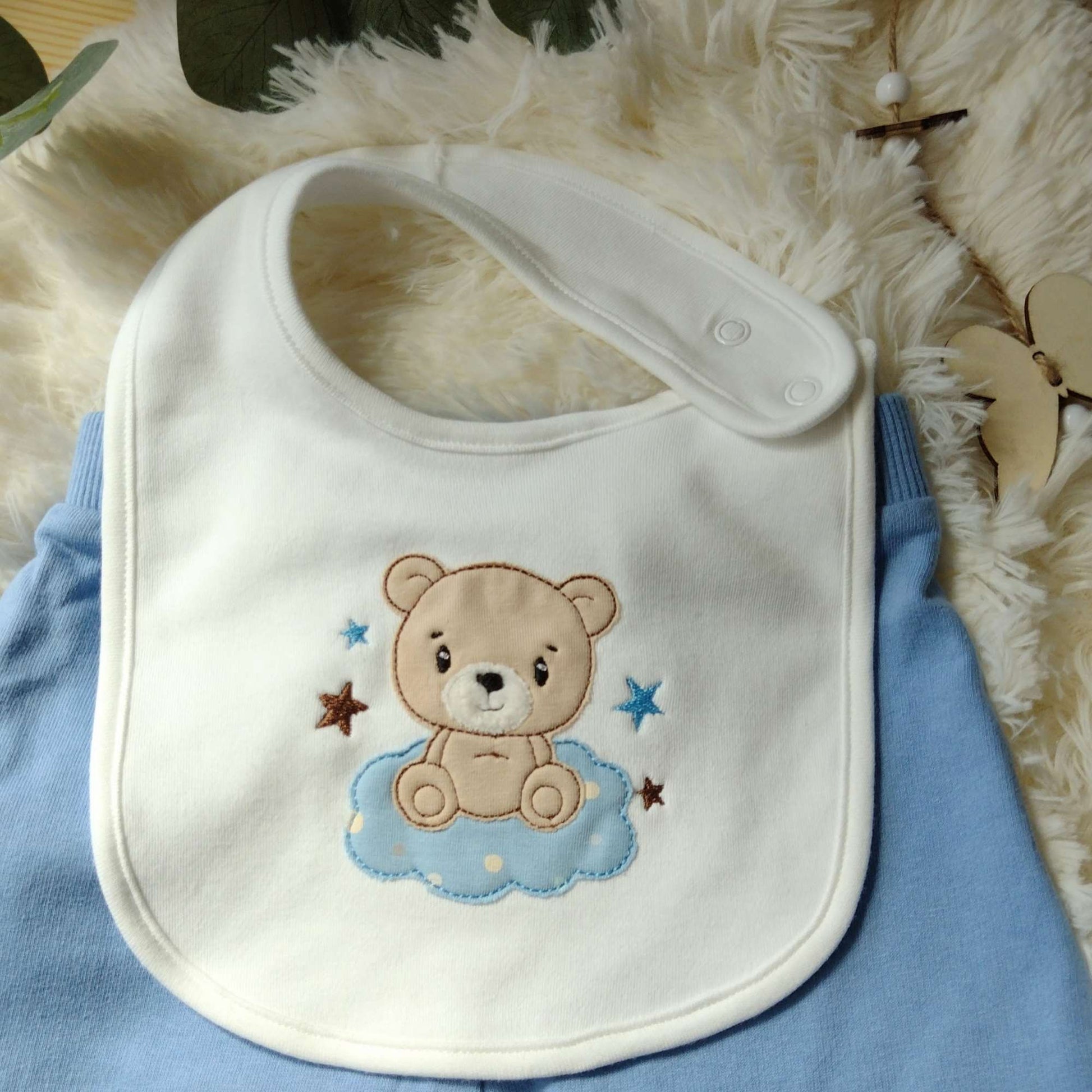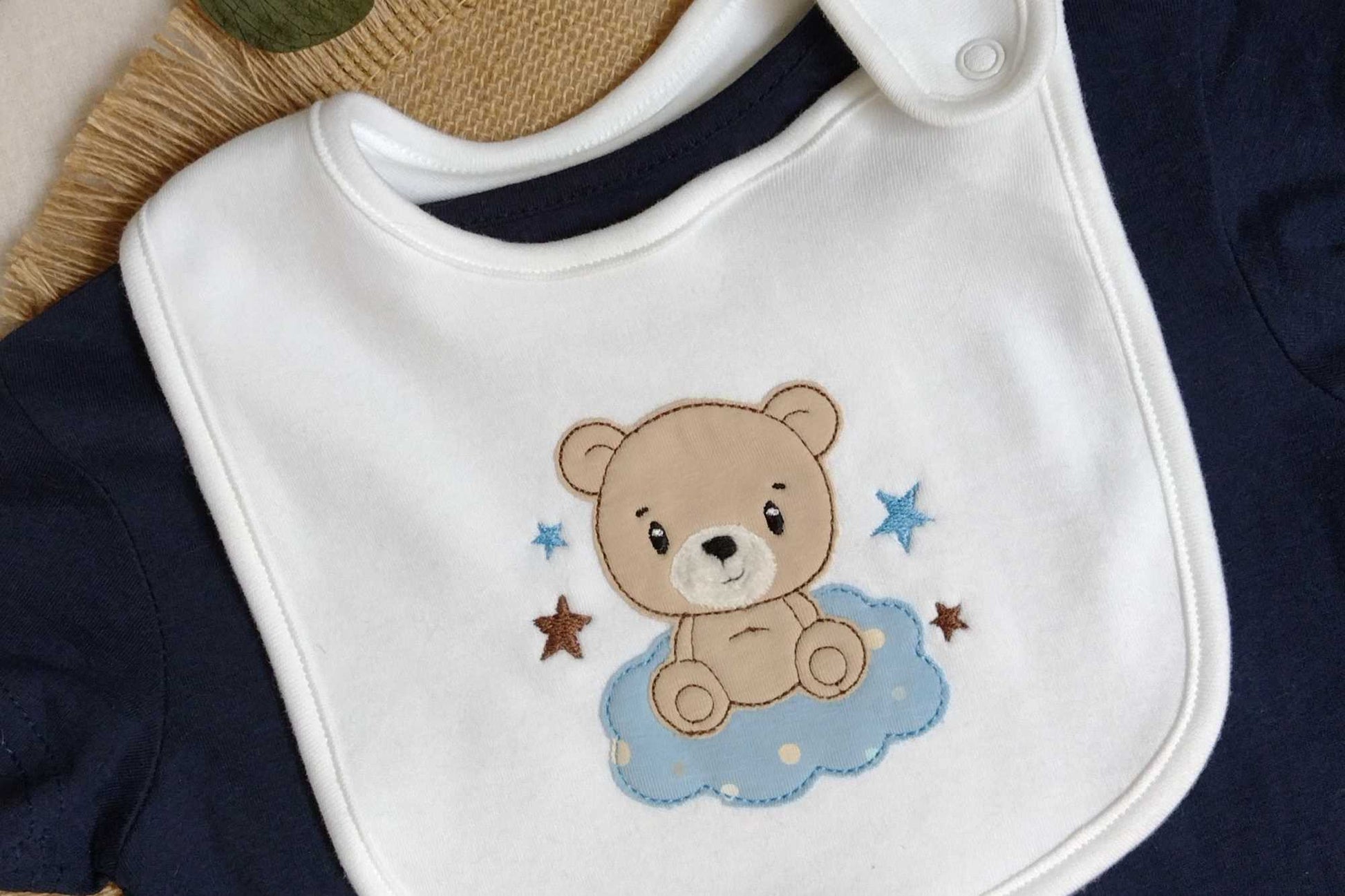 Jemná a nežná výšivka s motívom medvedíka na obláčiku, ideálna na zdobenie detského oblečenia, pyžamiek alebo výbavičky.